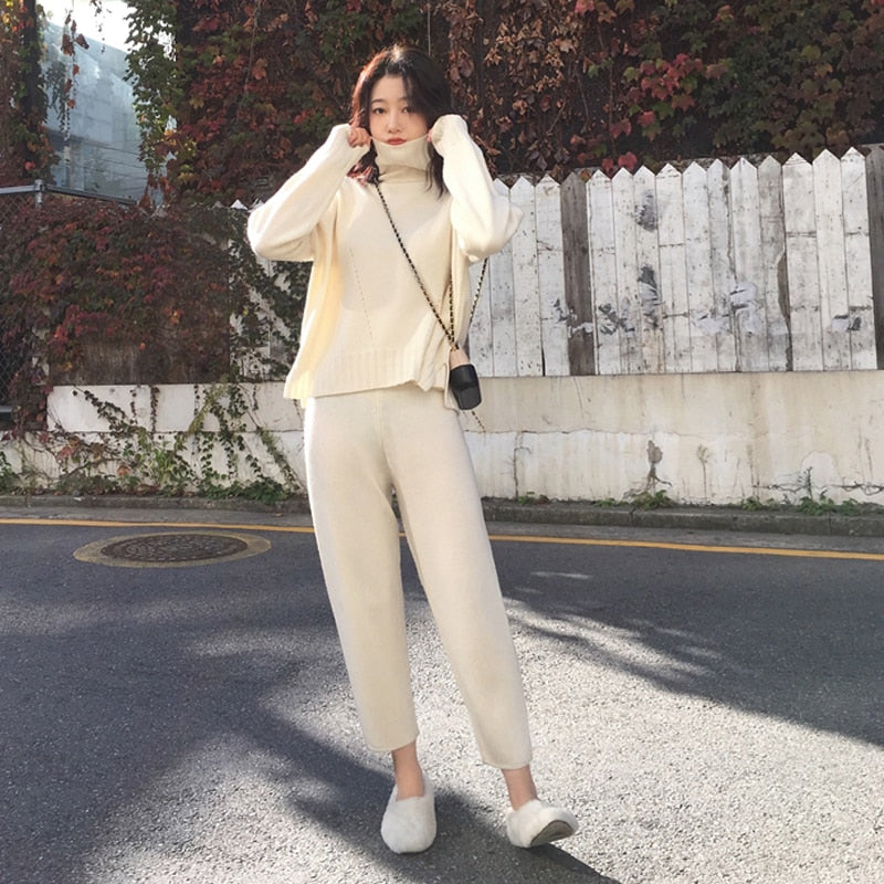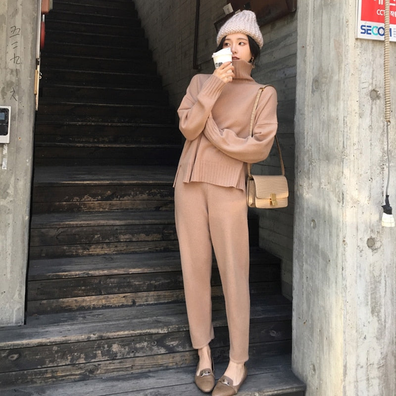 Casual Sweater Pants Knitted 2 Pieces Set Turtleneck Pullovers & Elastic Waist Pants Women Sweater Sets 2020 Autumn Knitted Set